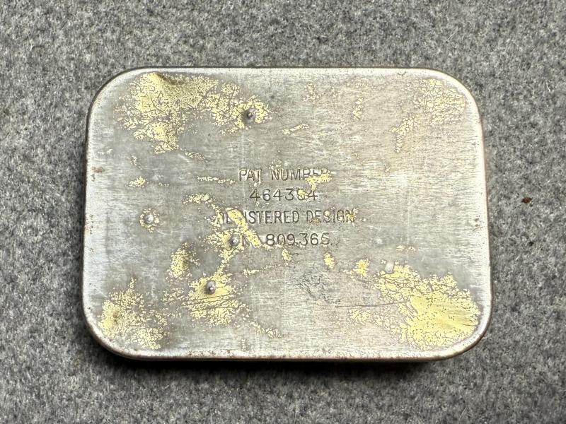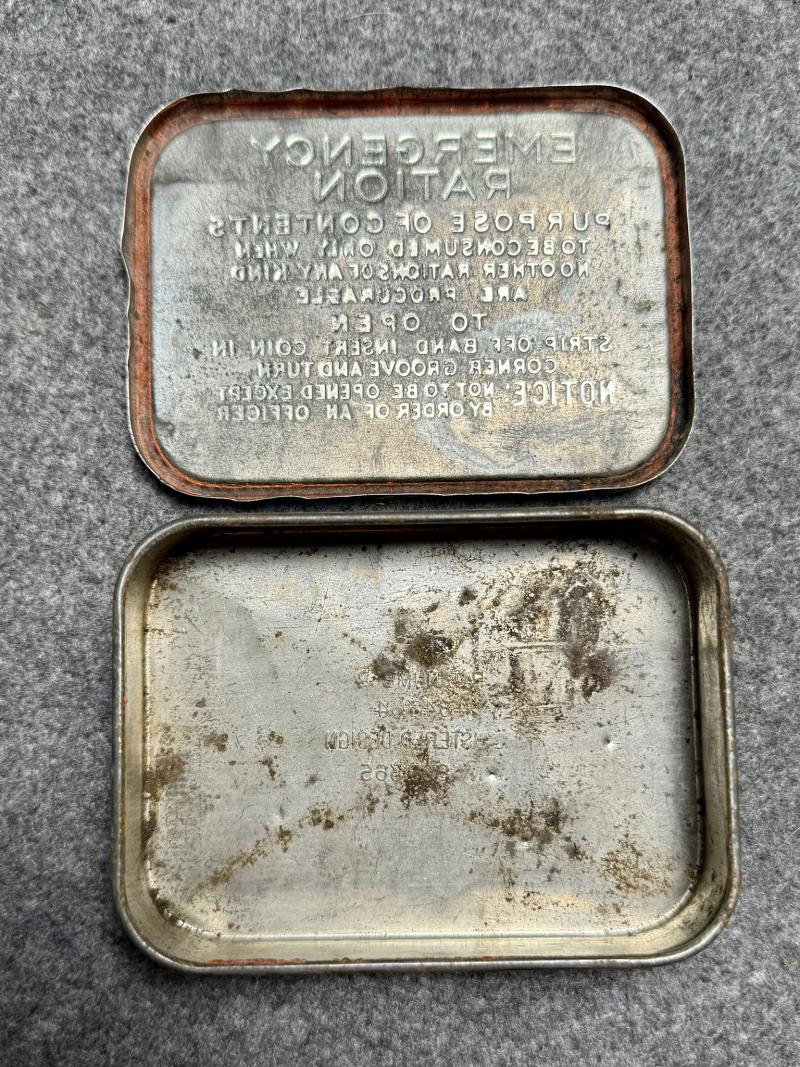 A good used example of the emergency rations tin with instructions embossed on the lid. Worn overall from use, tin with lid, no band or contents.