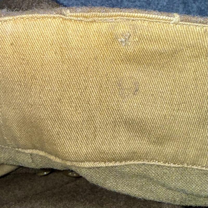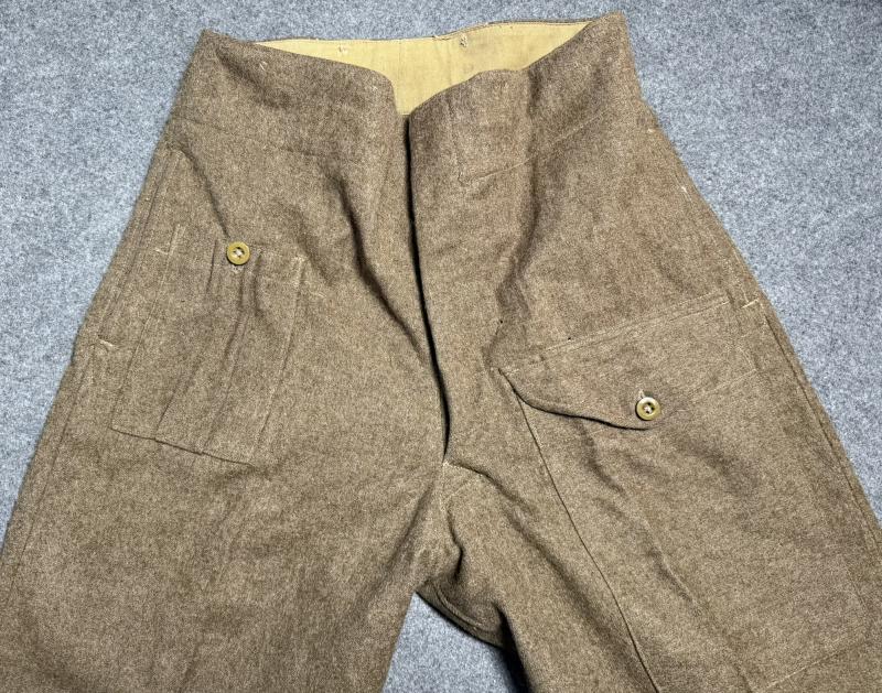 Standard 40/42 type BD trousers, no label but feint WD stamps inside. Good used condition overall but with a few small moth nips/holes, two buttons missing from inner waistband. Approx 32W/32L