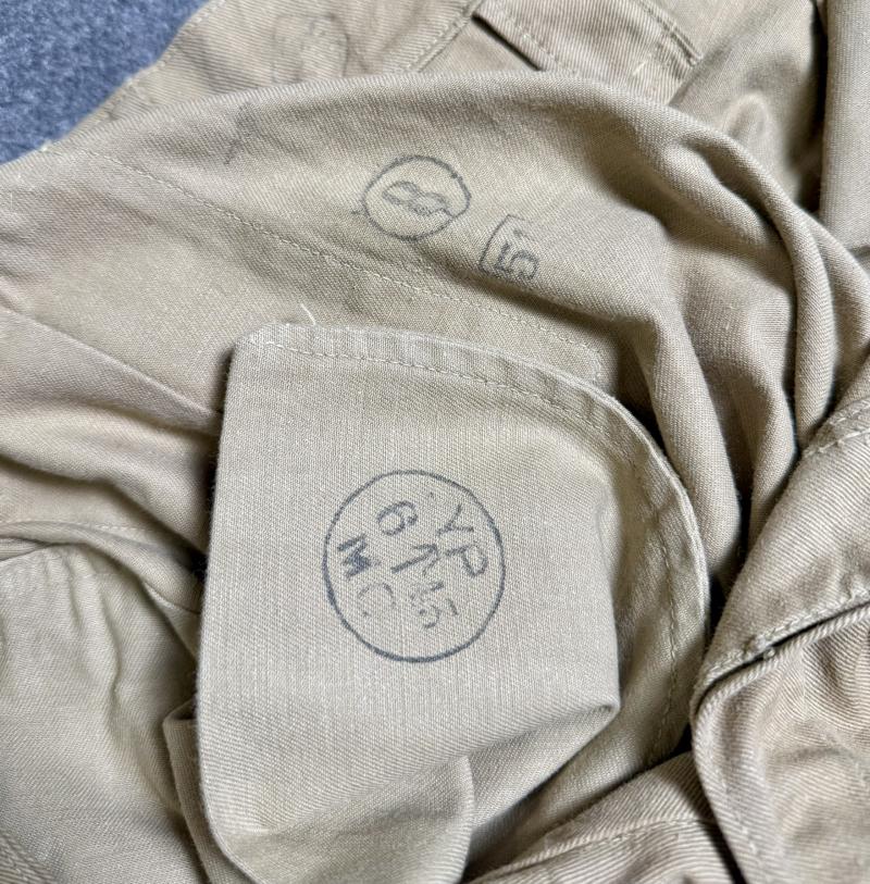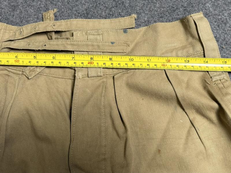 Smallish pair of KD shorts with various stamps inside, dated 6/43 and size 8, measure approx 15” across the waistband. Adjustment buckles absent, also missing two fly buttons. These have possibly been taken up at the hem, also they’ve had three buttons added at the back for attaching to battledress. Overall in very good used condition but with some slight marks from storage.