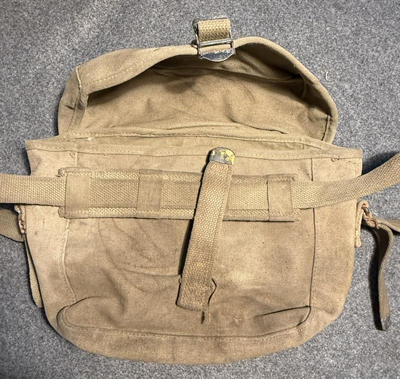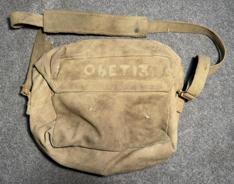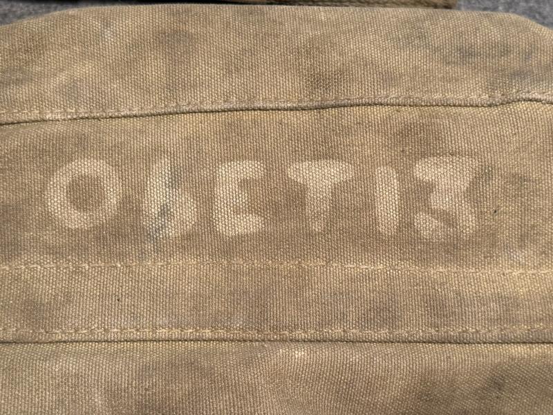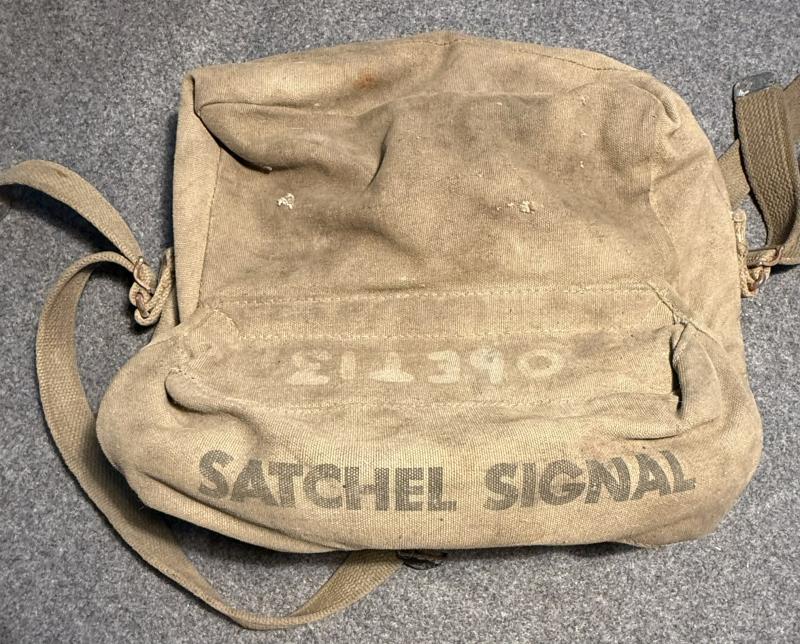 OD canvas and webbing version, US made and supplied with War Aid 19 Radio Sets. Good used condition but a little grubby. Lid stencilled with ‘Satchel Signal’ and with a painted id number O6ET13.