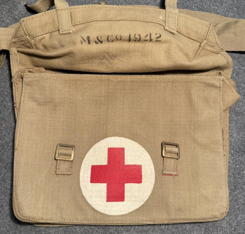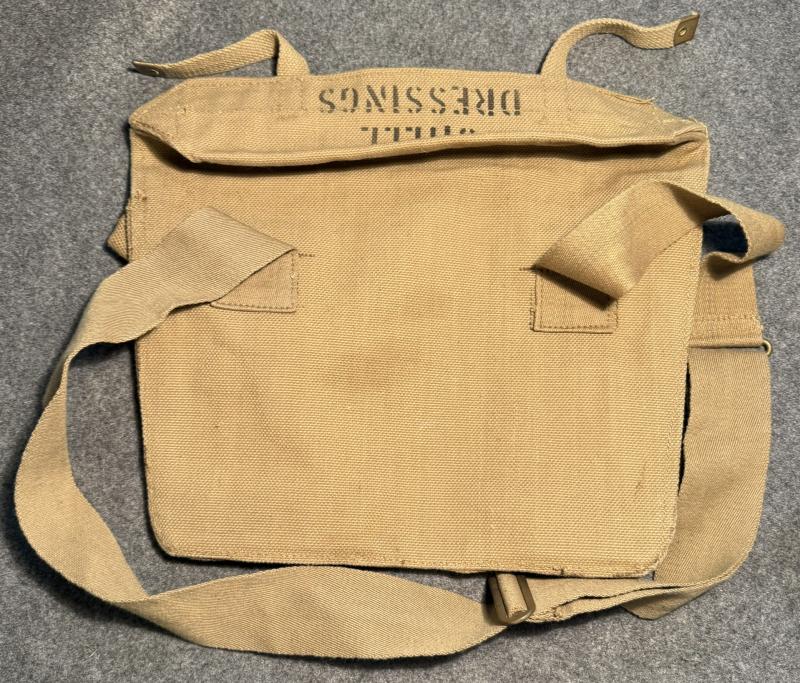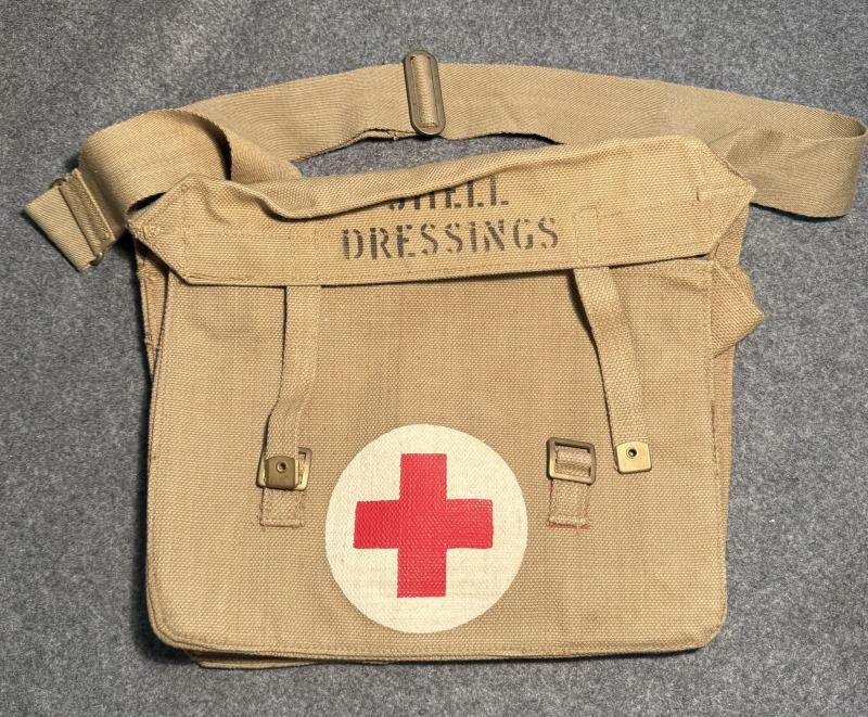 Webbing bag as carried by medics and stretcher bearers. ‘Shell Dressings’ stencilled in black on the top, Geneva Red Cross on a white circle painted to the front. Overall in very good condition, appears unused. Maker marked M&Co and dated 1942