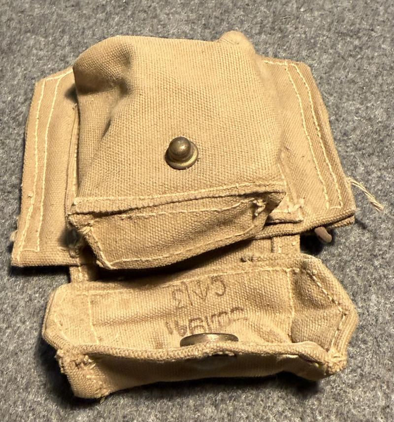 Indian manufactured 37 pattern pouch in tan canvas instead of webbing. Maker marked and dated 1941. Very good condition, slight marks from storage but appears unused