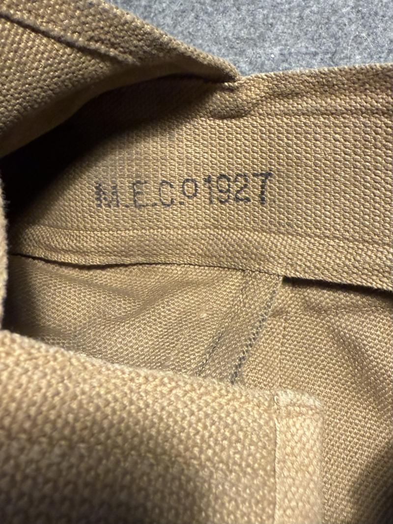 Standard circular webbing pouch for Lewis gun magazines, maker marked inside MECo and dated 1927, also with naval acceptance stamps N with arrow and number 4. C in white paint to the reverse