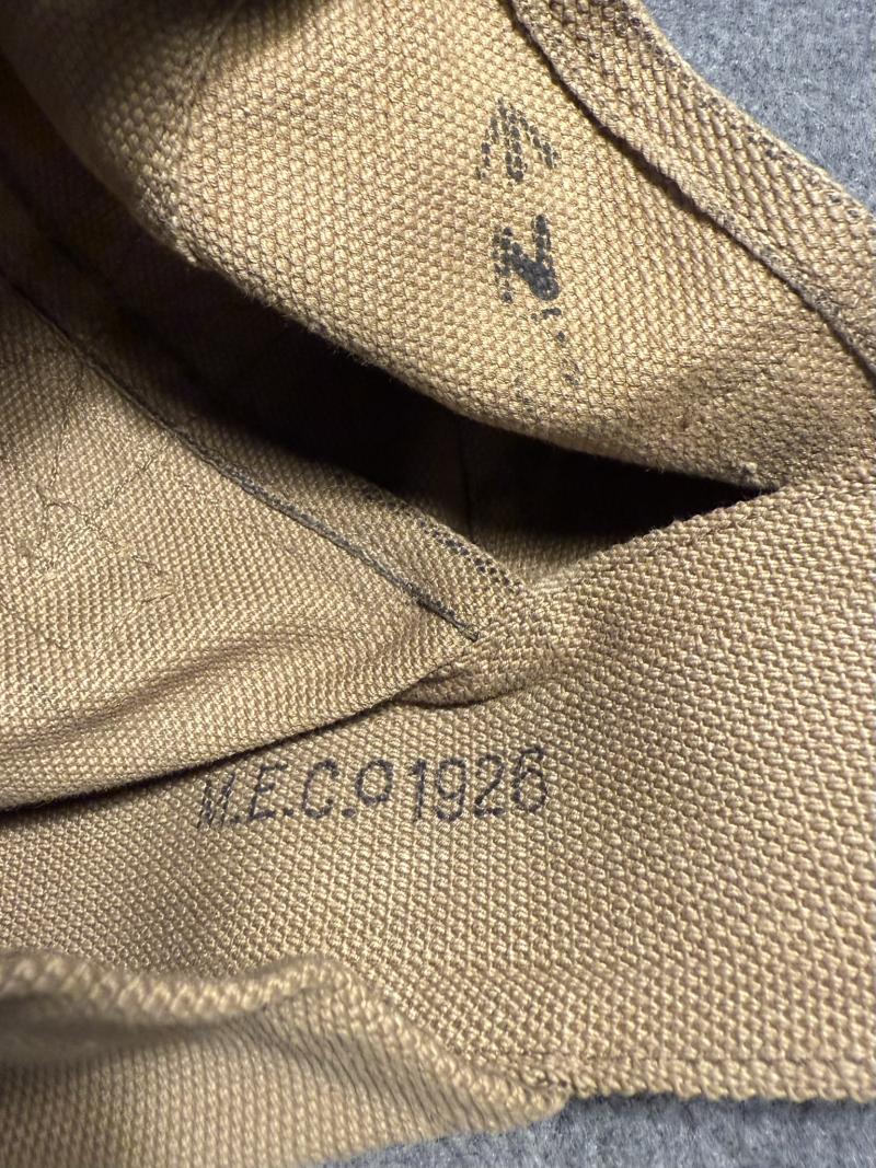 Standard circular webbing pouch for Lewis gun magazines, maker marked inside MECo and dated 1926, also with naval acceptance stamps N with arrow and number