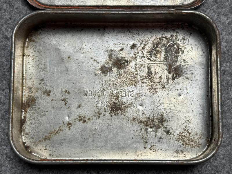 A good used example of the emergency rations tin with instructions embossed on the lid. Worn overall from use, tin with lid, no band or contents.